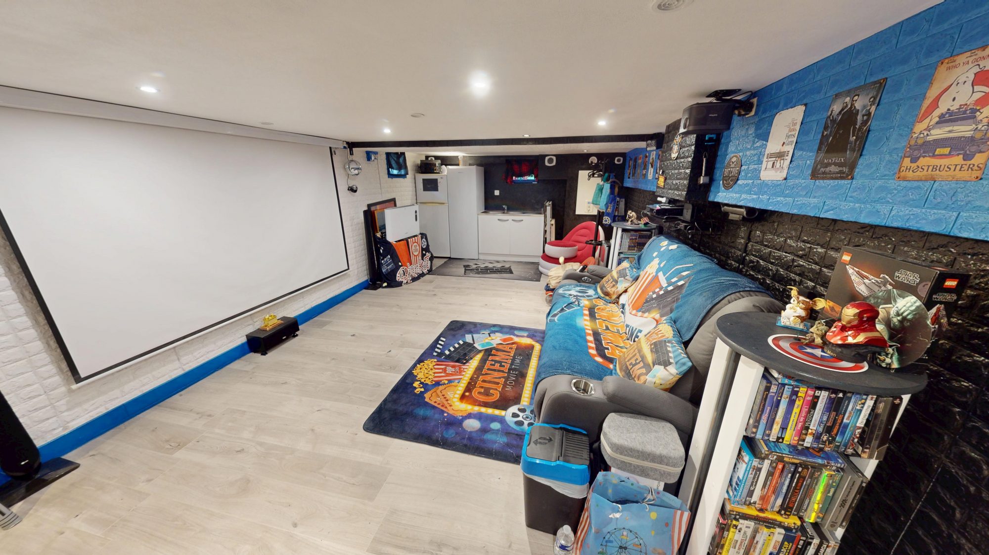 Le sous sol offrant 45 m2 supplémentaire, avec une belle salle cinéma (35 m2), 1 pièce rénovée pour salle de jeux et/ou stockage (valises, équipements cuisine, etc) et 1 évier.