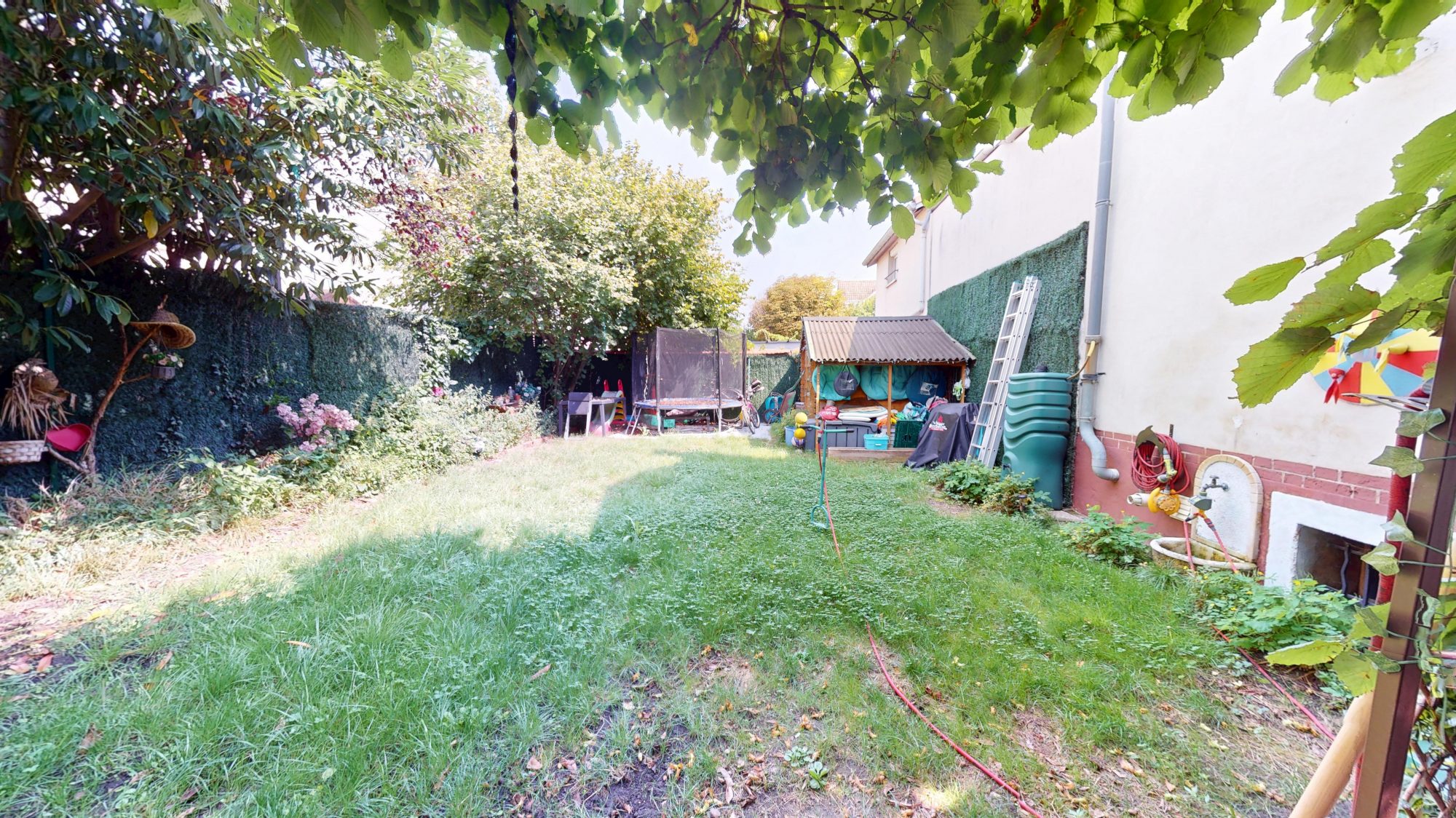 Un jardin arboré de plus de 100 m2 permettant de profiter de bons moments en extérieur, avec terrasse, trampoline.