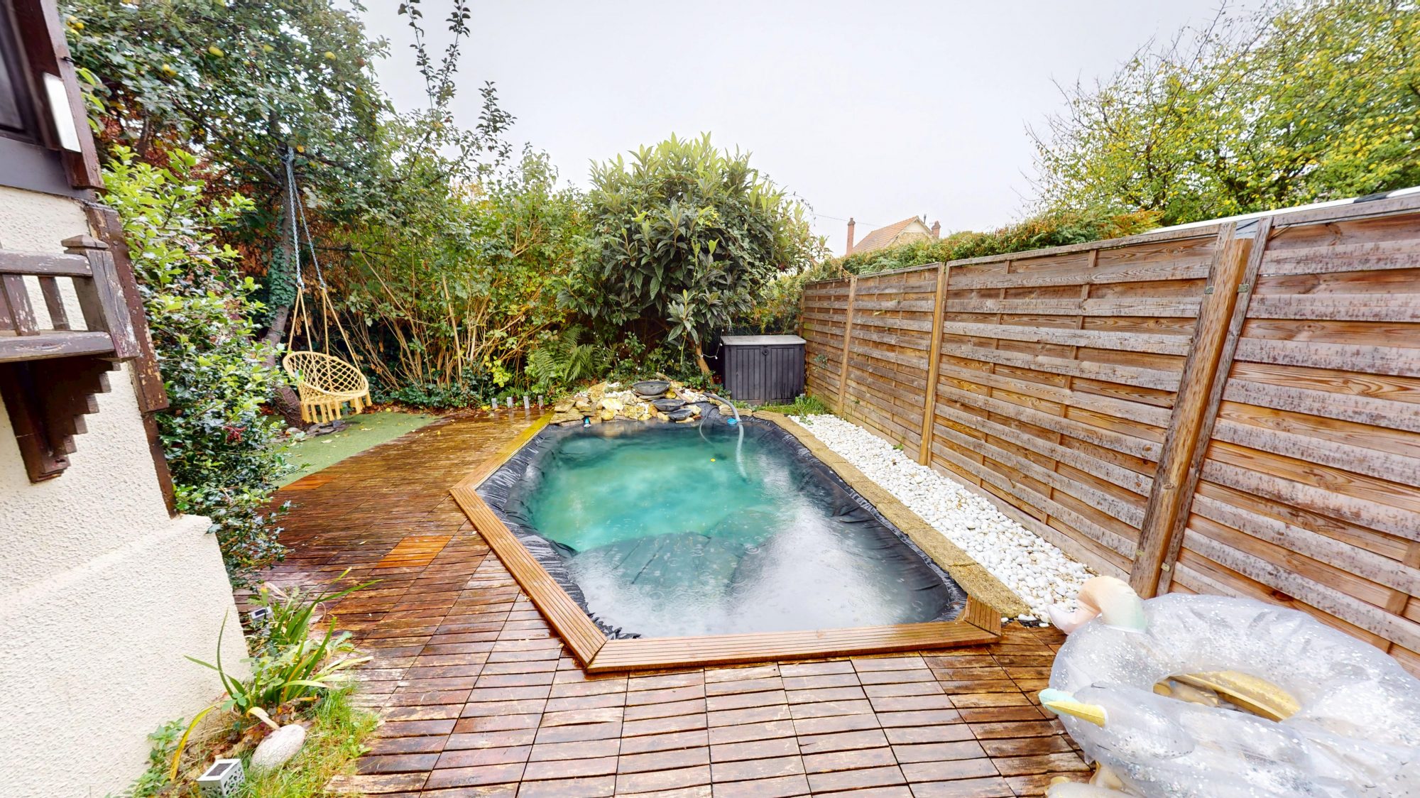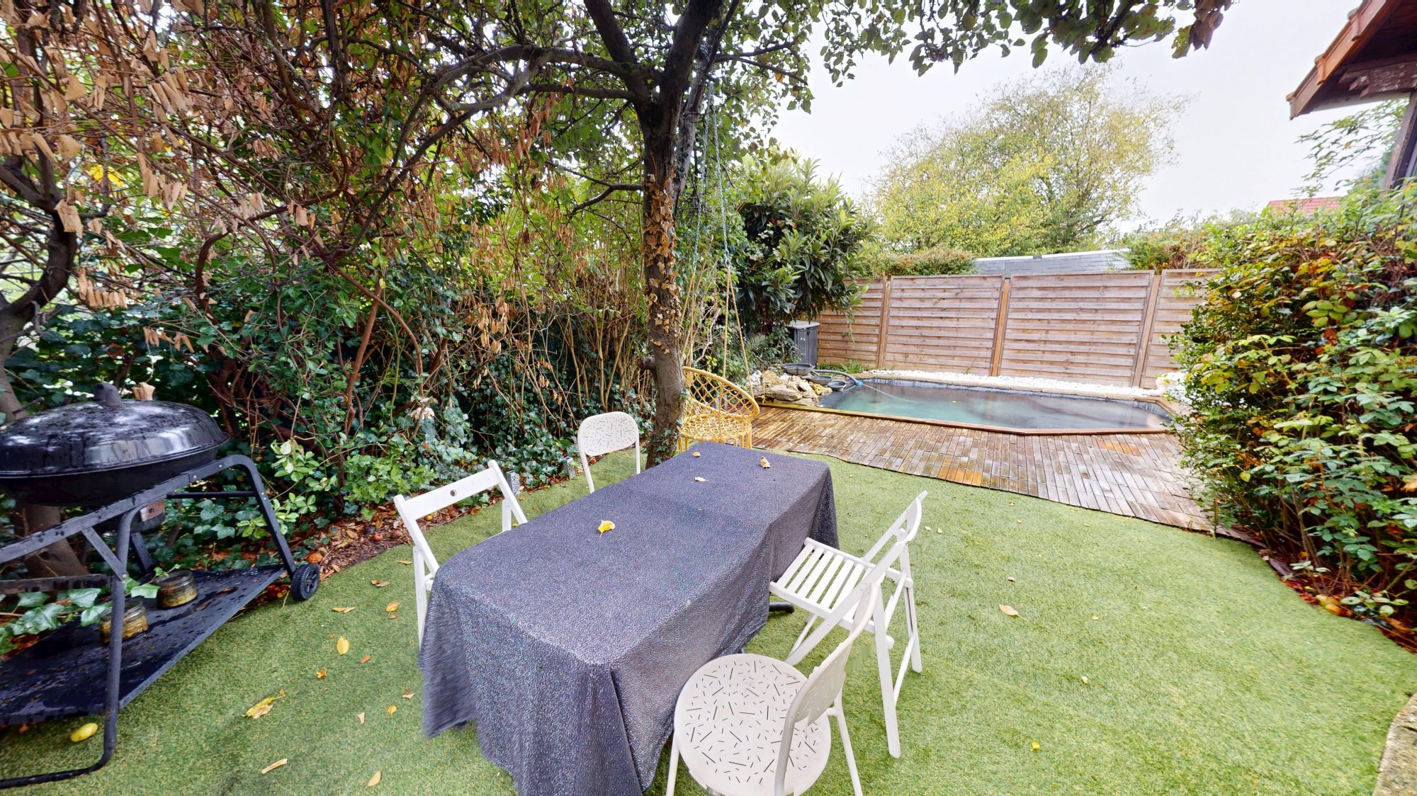 Le jardin, un véritable écrin de verdure, avec terrasse et piscine.
